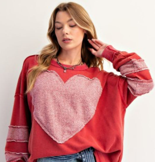 Red loose fit sweatshirt with large heart and sleeve stripes