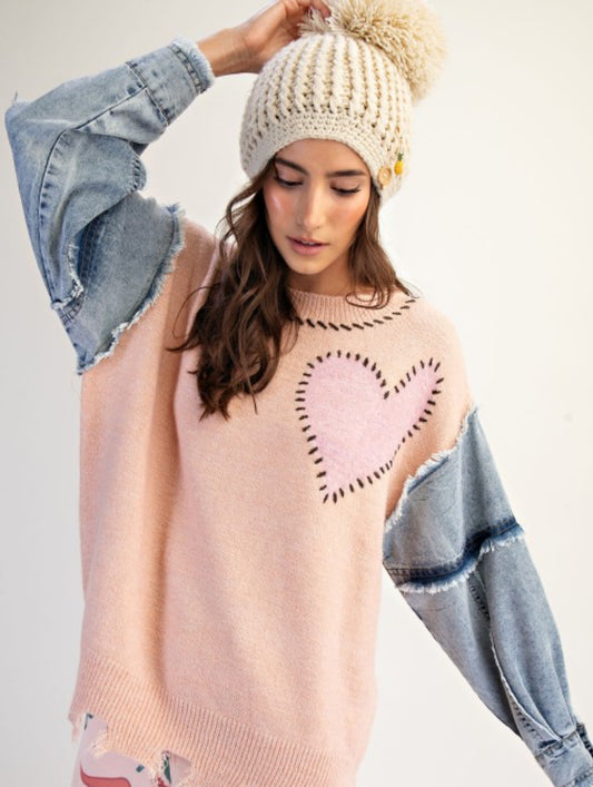 BACK IN STOCK! Lightweight, oversized sweater with heart and denim sleeves (see pic 2 for pink)