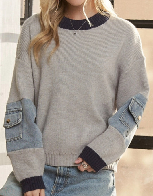 RESTOCKED! Grey sweater with colorblock trim and denim pockets