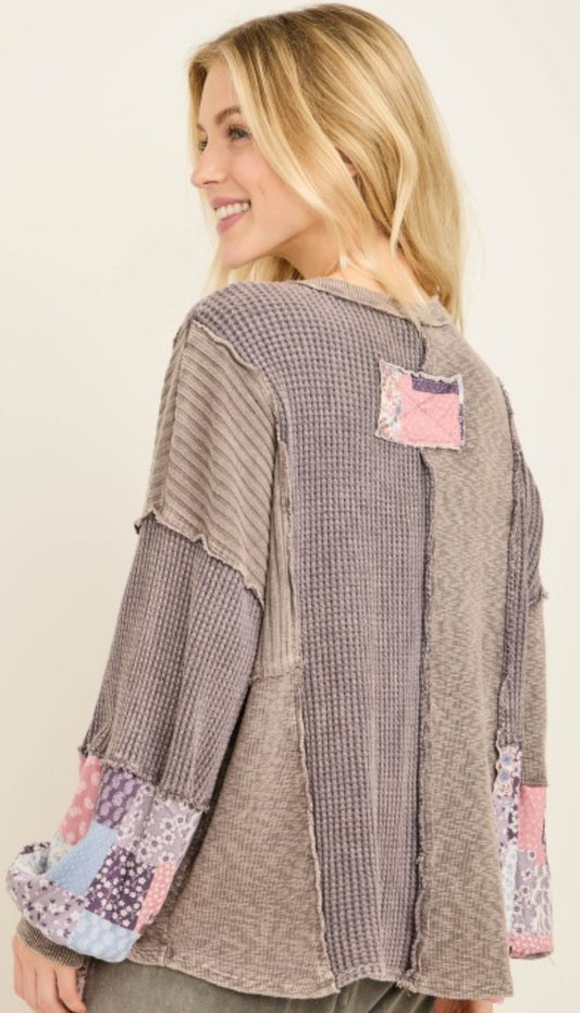 RESTOCKED! Grey sweater with colorblock trim and denim pockets