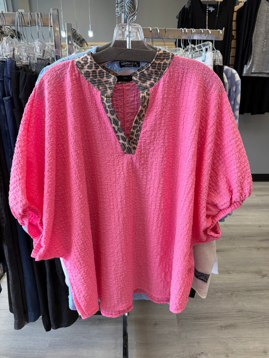Pink loose fit elbow sleeve top with leopard trim PLEASE NOTE: pink is brighter in person, see pic 2