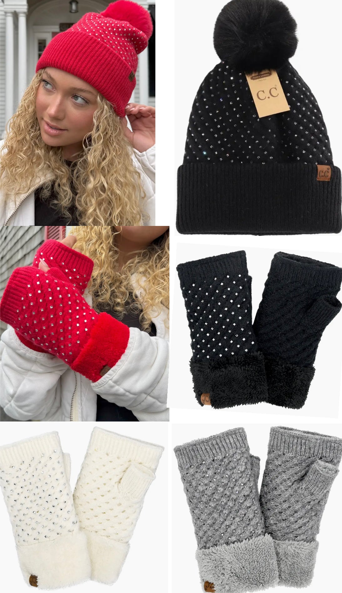CC rhinestone pom hat and fingerless gloves, both with warm, soft lining