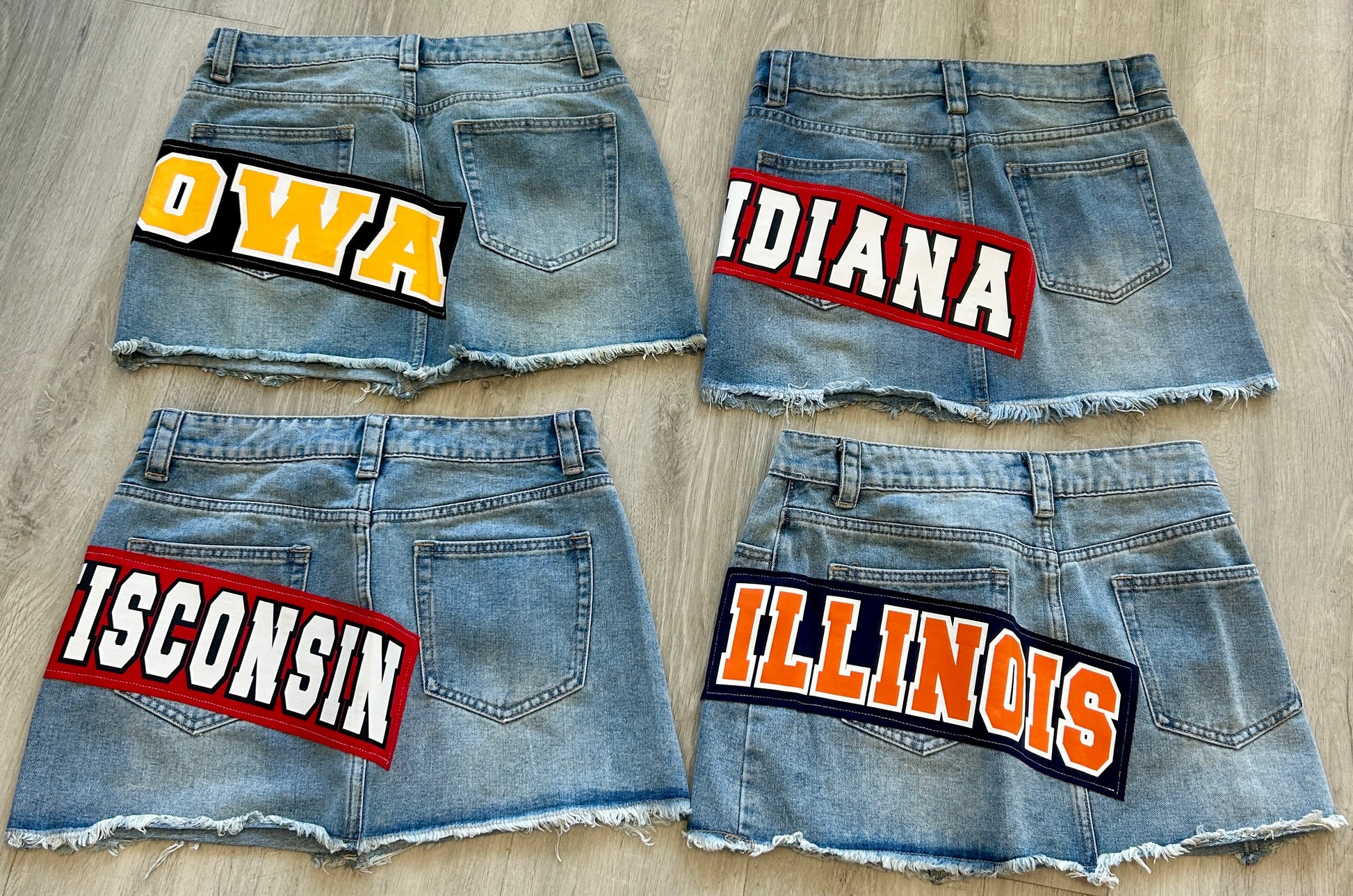 IN STOCK & Custom denim skirt with patch (order for ANY school or camp and tube top sold separately on our website)