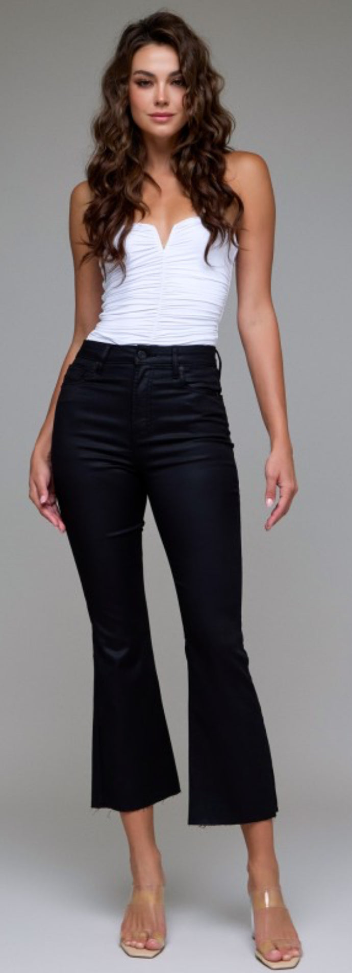 Hidden black coated crop flares, 11" rise and 27" inseam