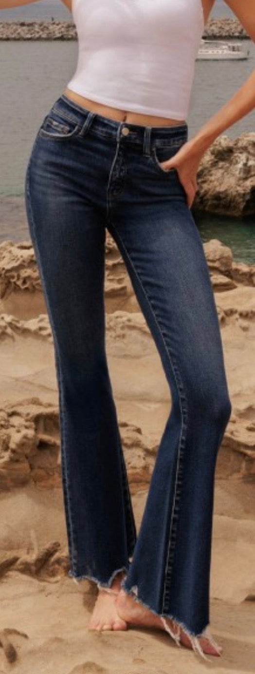 10” rise, 32” inseam stretch flare jeans with distressed hem