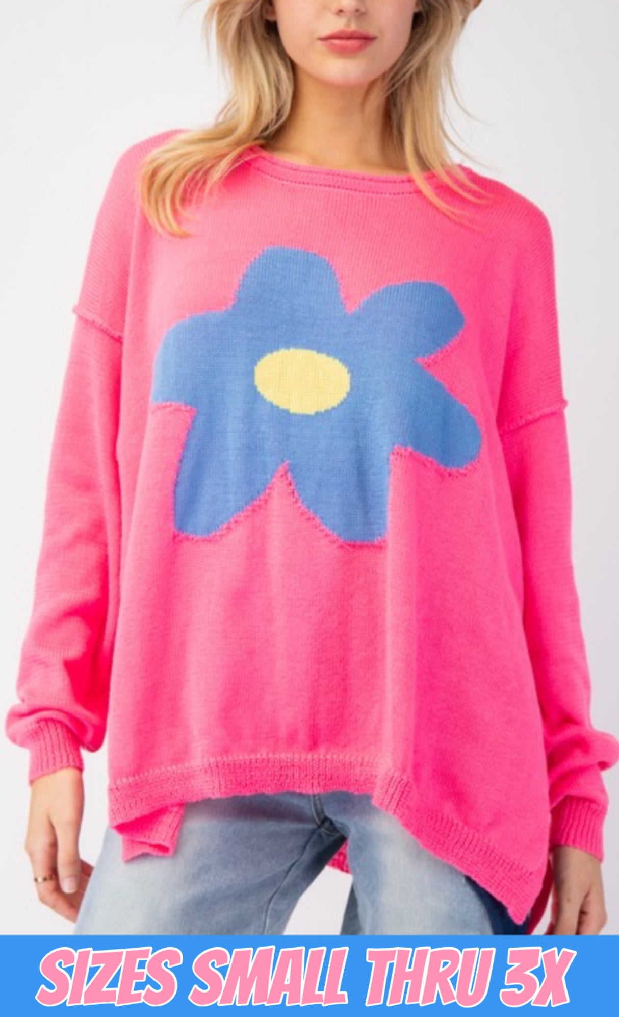 Runs generous! Bright pink oversized lightweight sweater with daisy