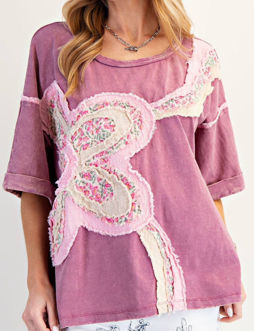 Plum top with mixed floral daisy patches